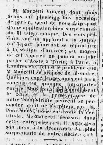 Nell’estate del 1865, quando gli amici e i conoscenti convinsero finalmente Manzetti a presentare pubblicamente il telefono di sua ideazione, ad Aosta fu un accorrere di curiosi.