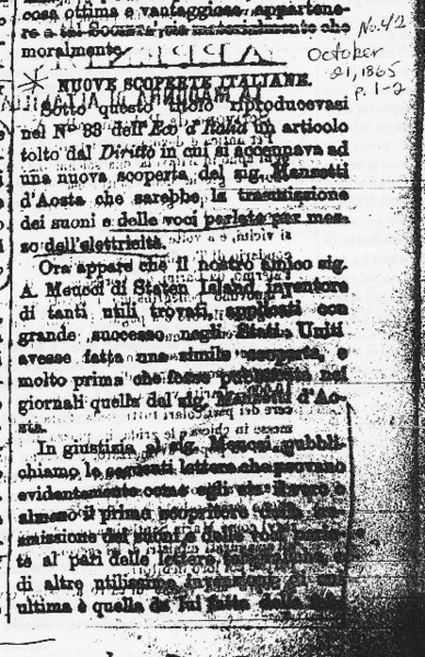 Nell’autunno dello stesso anno la notizia giunse anche a New York. Il 19 ottobre 1865 l’Eco d’Italia aveva pubblicato la notizia dell’invenzione fatta ad Aosta e l’inventore italo-americano Antonio Meucci aveva ravvisato in quelle descrizioni gli elementi del suo “telettrofono”. Scrisse, allora, al giornale augurandosi che qualcuno potesse contattare Manzetti e informarlo del suo ritrovato, dichiarando nel contempo di non poter negare la priorità del valdostano nell’invenzione. Ma dalle sue descrizioni emerse subito come l’apparato da lui realizzato fosse nettamente meno avanzato rispetto a quello di Manzetti.